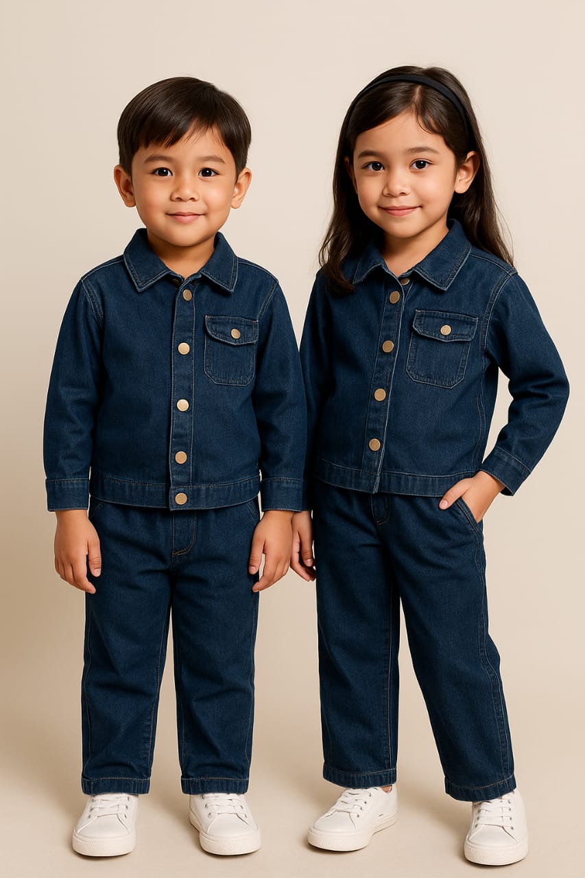 Tampil bergaya dan selesa dengan set baju denim unisex ini yang sesuai untuk kanak-kanak lelaki dan perempuan umur 1 hingga 8 tahun. Dihasilkan daripada material denim lembut berkualiti premium, ia memberi keselesaan maksimum sepanjang hari tanpa rasa panas atau gatal.